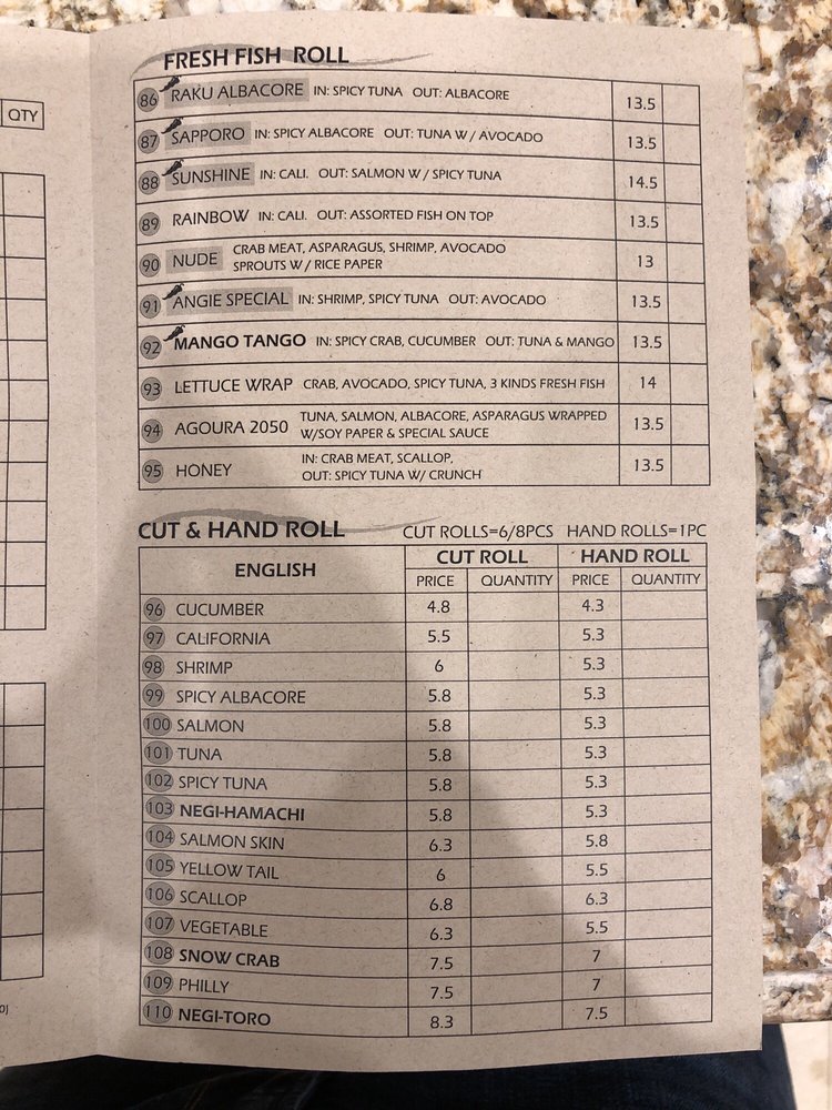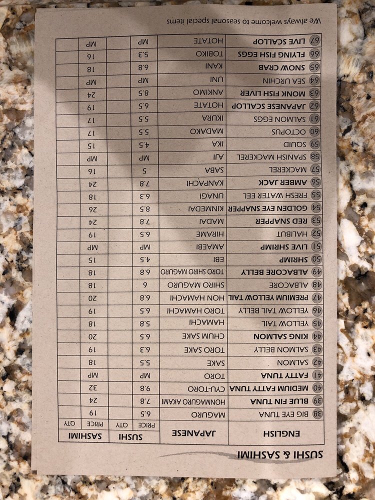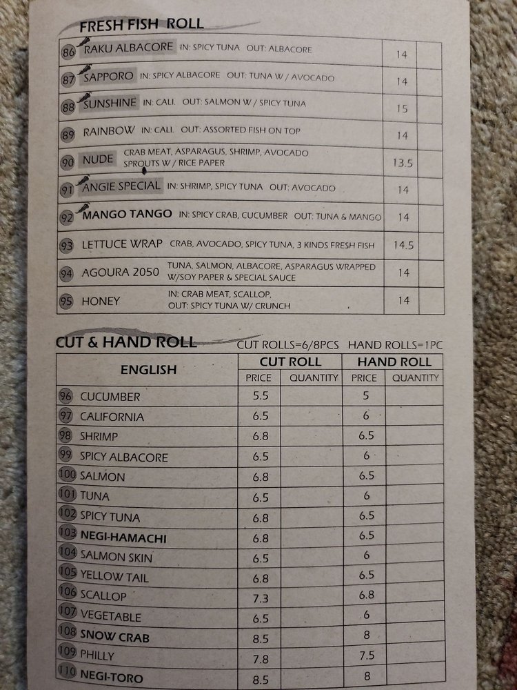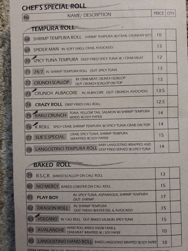 In: Spicy Tuna, Cucumber, Out: Avocado with Jalapeno